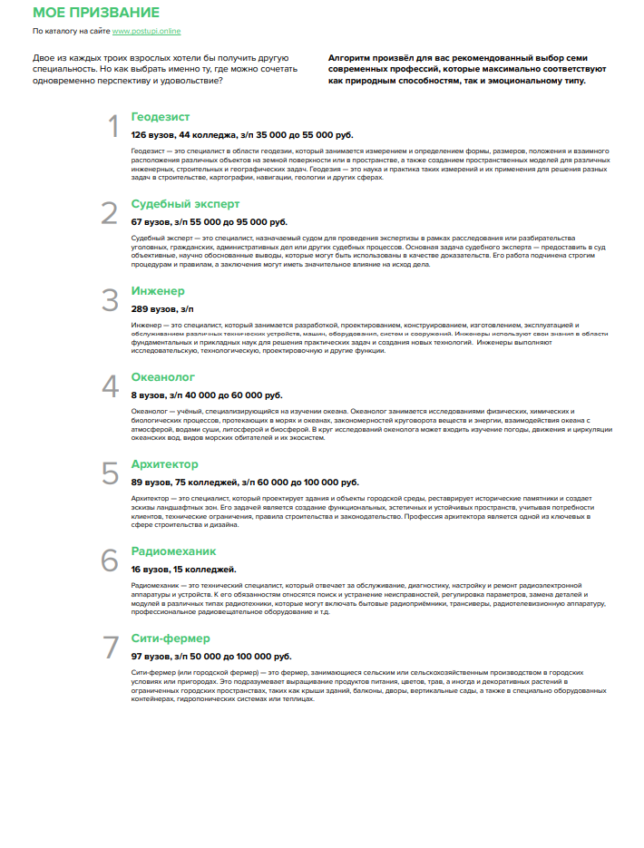 В этом блоке алгоритм подбирает 7 наиболее подходящих по природными данным профессий